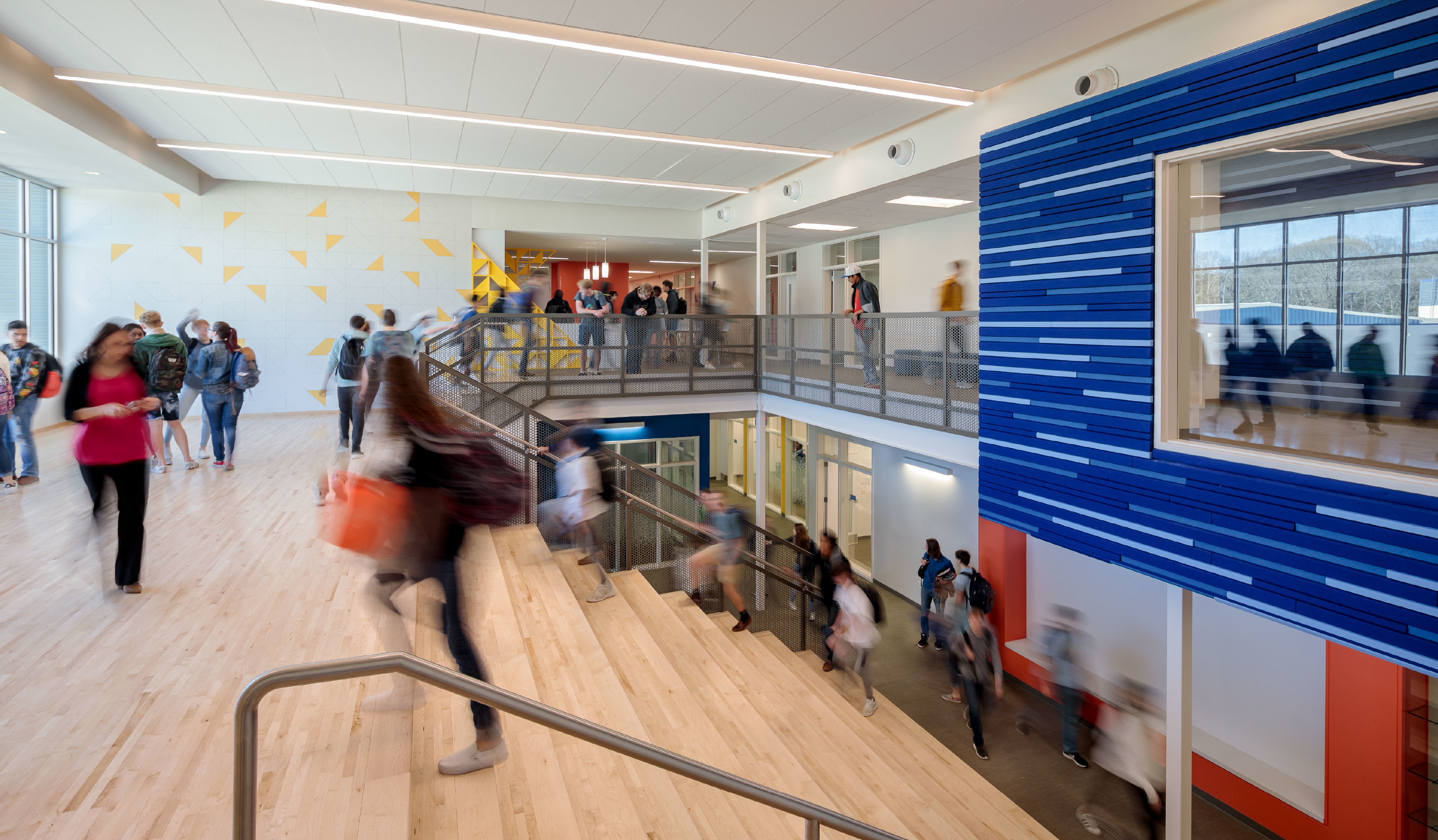 A focus was placed on the functional, leaving funds to accentuate areas such as the performing arts center, which includes a tile wall and tile floor in the lobby. FACE drove the design, with spaces built for flexibility, in addition to access, collaboration and engagement. Makerspaces were designed to support multiple uses. For example, a wide, wooden stairway in one academic building can double as bleacher seating for a small, indoor amphitheater.