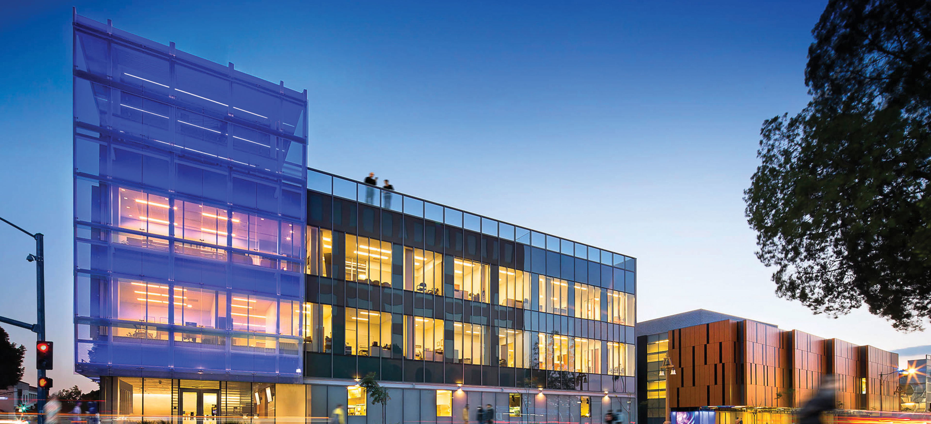The building is clad in insulated glass to maximize natural light and open the activities of the school to the public. A shingled glass tower anchors the design, creating shading and an iconic beacon that lights up at night.