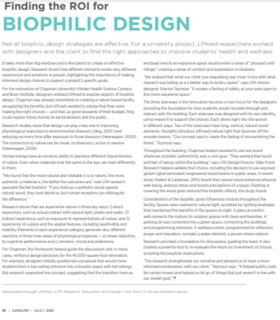 For the renovation of Chapman University’s Rinker Health Science Campus and Brain Institute, designers enlisted LPAred to explore aspects of biophilic design. Chapman was already committed to creating a nature-based facility, recognizing the benefits, but officials wanted to ensure that they were making the right choices — and that, as good stewards of their budget, they could explain those choices to administrators and the public.